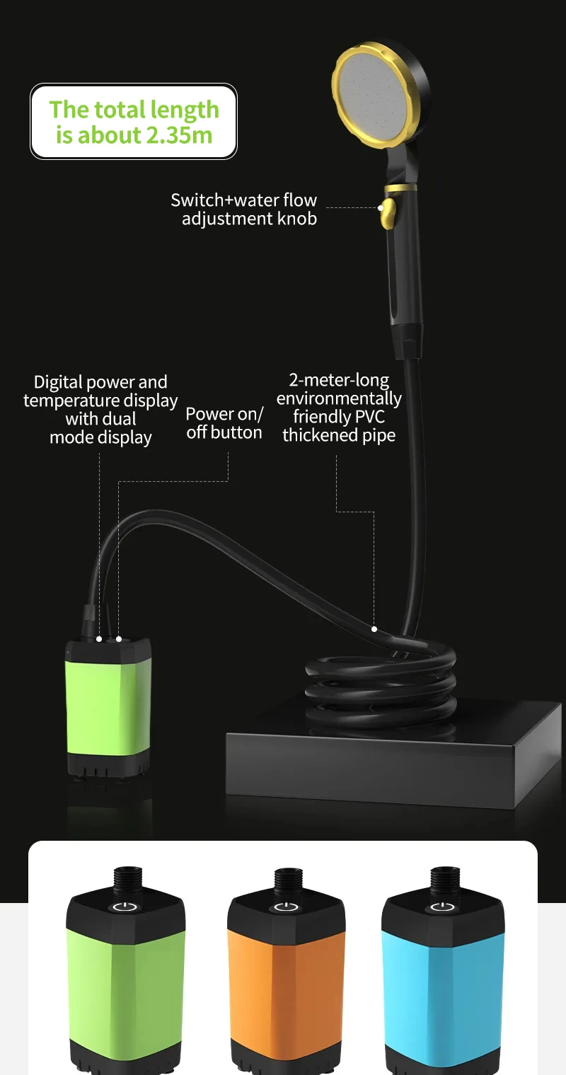This portable camping shower pump is perfect for all your outdoor adventures. With a full screen intelligent digital display, you can easily monitor the temperature and battery level. The high-efficiency energy-saving mode is adjustable to suit your needs. The shower pump is powered by a 6000mAh battery that charges in just 1-2 hours. It's the perfect addition to your RV outdoor shower kit.