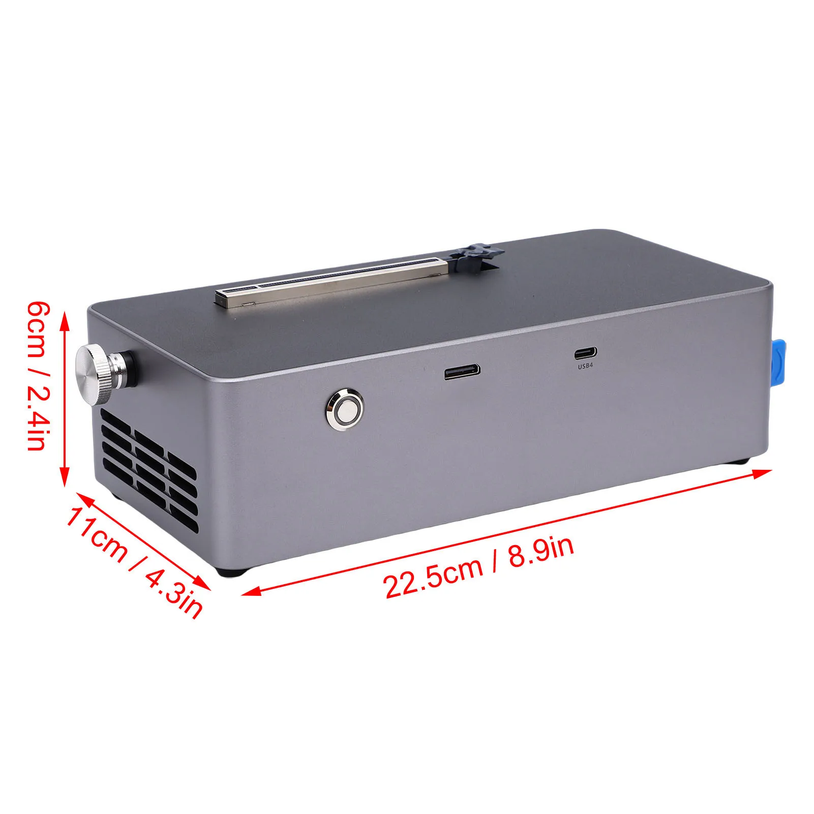 2. [Product Specifications] This external GPU docking station features an open metal chassis design with an aluminum alloy middle frame, sturdy yet lightweight. It measures 22.5 x 11 x 6cm and weighs 1.8KG, supporting graphics cards of various lengths