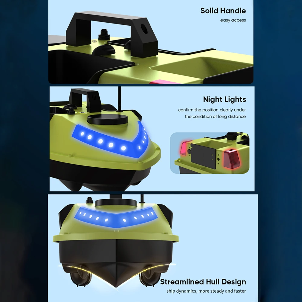 5200mAh / 12000mAh rechargeable battery for long working life. The boat automatically returns in low battery.